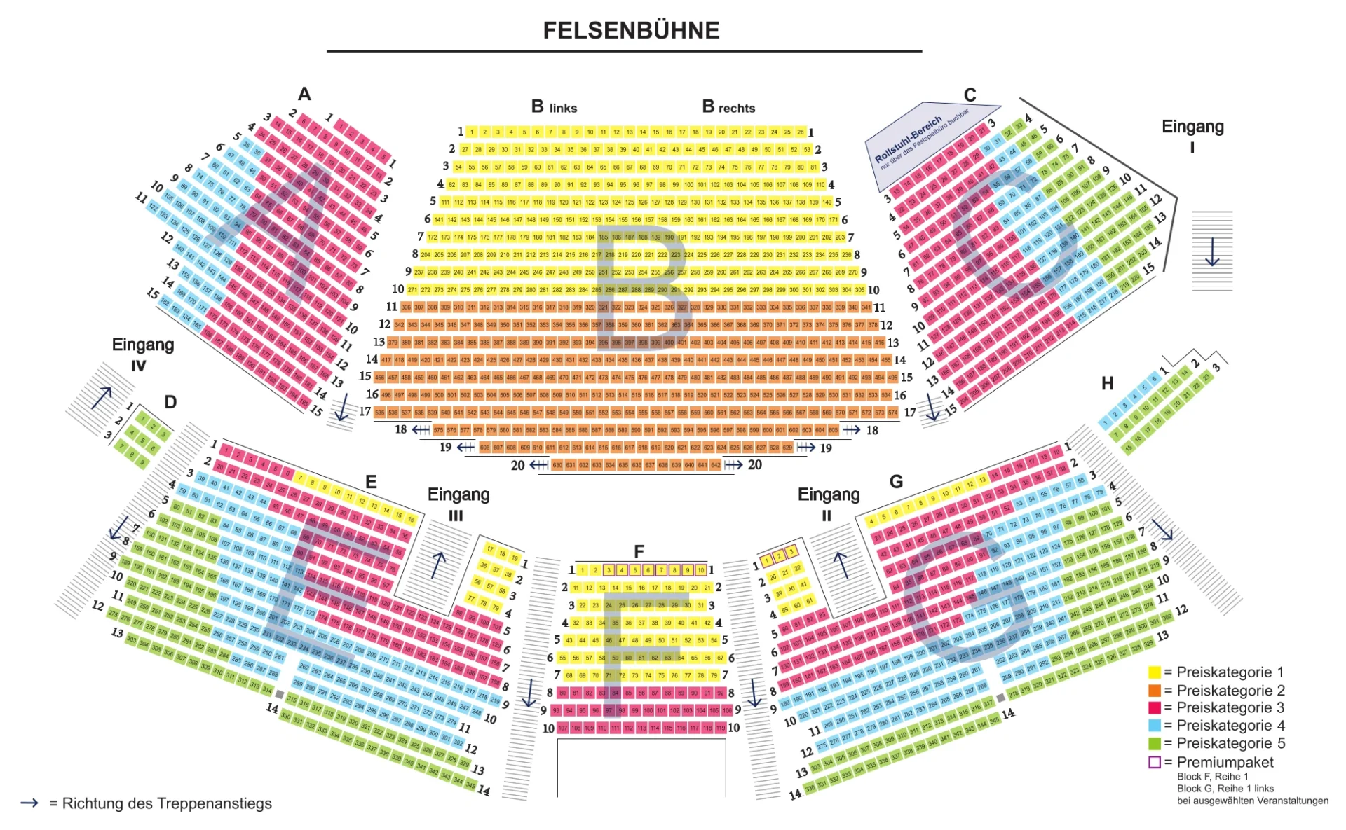 - Zuschauerbereich: In Blöcken A bis H angeordnet, halbkreisförmig zur Bühne.
